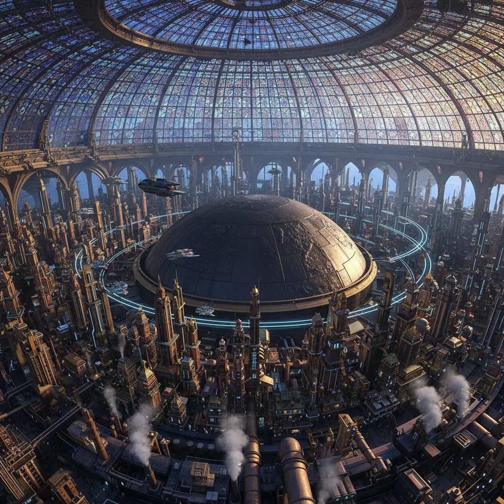 Wer den Core betritt, spürt sofort die massive Gravitation des zentralen Kometen, die der Station eine unnatürliche, aber beruhigende Stabilität verleiht. Die Luft riecht nach einer Mischung aus antikem Metall, teurem Parfüm im Regierungsviertel und einer subtilen, feuchten Note, die von den riesigen Wasserspeichern tief im Inneren stammt. Das Licht wird durch die gewaltige, kunstvolle Kuppel aus Goldfiligran und Buntglas gefiltert, was die Stadt in ein ewiges, sakrales Abendrot taucht. Ein ständiges, tiefes Brummen – das „Lied des Kerns“ – zeugt von der Arbeit der massiven Wärmetauscher und Dampfkraftwerke.